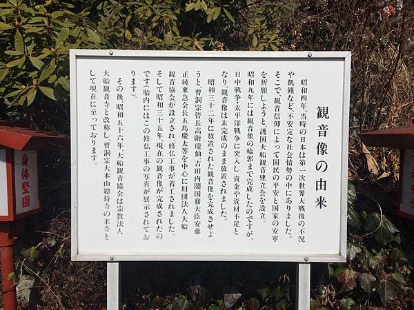 觀音像也因此暫時停工,過了23年,在昭和32年時,曹洞宗管長、吉田內閣國務大臣及東急的會長